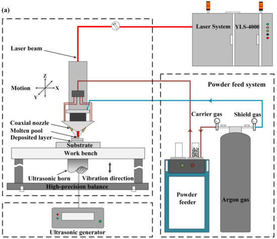 Schematic illustrations of ultrasonic-assisted laser metal deposition: (a) experimental device; and (b) deposited layer size and scan path.