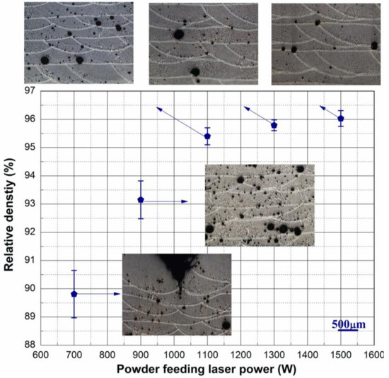 Metallographic images of the XZ section and plot showing the effect of powder feeding laser power on the relative density.