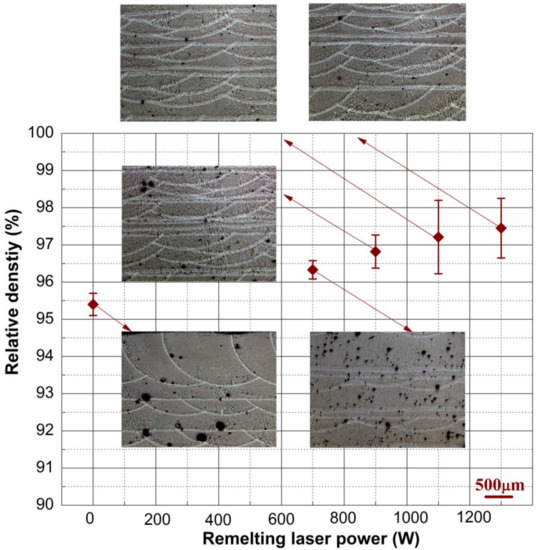 To further remove the residual pores in the samples, the same deposited layer was remelted. The relationship between the remelting laser power and the relative density values of the samples is shown in Figure 3. As the Pr increased from 0 W to 1300 W, the average relative density of the samples improved from 95.4% to 97.4%. In the powder-feeding laser deposition process, the powder had a large specific surface area, and the surface crystallization water was the main source of hydrogen in the laser molten pool [27]. The powder was not introduced during the remelting process, which reduced the source of hydrogen. In addition, the remelting process facilitated the escape of existing hydrogen pores, resulting in a reduction of the pore content in the samples.