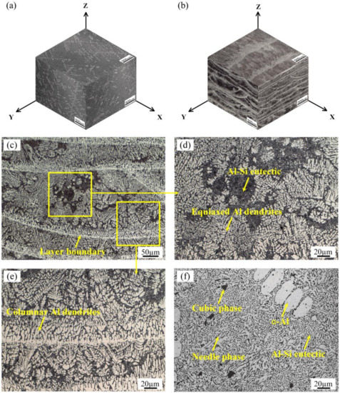 OM micrographs of the Al 4047samples: (a) 3D microstructure built by casting; (b) 3D microstructure built by the ultrasonic-assisted laser metal deposition UALMD; (c) amplifying the metallographic structure of the XZ section in 4b; (d) the equiaxed dendrite near the top of the layer; (e) the columnar dendrite at the bottom of the layer; and (f) amplification of the metallographic structure in 4a.