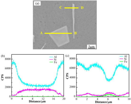To distinguish the components of fine cubic phases and needle phases in the metallographic structure of Figure 4f, the SEM microstructural observations and the corresponding elemental distribution along the linear scan of the different phases were examined on the cast samples, as shown in Figure 6. To ensure the accuracy of the line scan component, the specimen was not corroded. According to the metallographic and scanning electron micrographs, the cast structure of Al 4047 alloys consisted of three structured-type phases: an Al phase, Si phase and iron-rich phase. The silicon phase existed in two forms, one of which was a cubic form with a size of 5–35 µm and was discretely distributed in the Al alloys (Figure 6a), and the second type had a coarse rod shape with an aspect ratio of 1:1–1:20 and alternately existed with α-Al platelets in the eutectic structure (Figure 4f). The iron-rich phases were long and needle-like, and the iron originated from the casting process (Figure 6a).