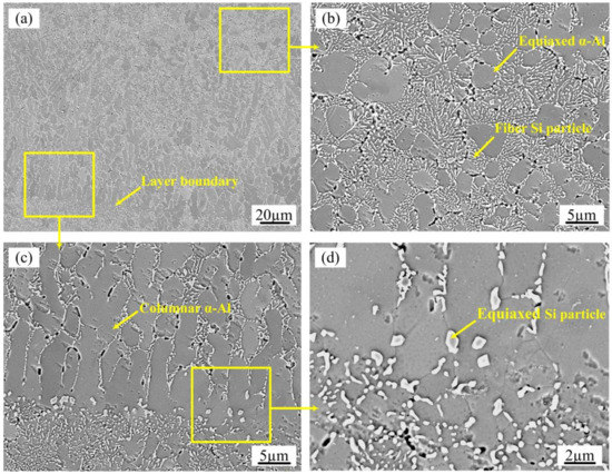 Figure 7 shows the SEM microstructure of the XZ section of the UALMD-prepared samples. The microstructure of the samples was composed of an Al-matrix reinforced with Si particles (Figure 7a). In addition, there were small black voids between the dendrites caused by the removal of the silicon particles during the etching process. Smaller Si with a mean size of <2 µm was obtained in the UALMD-processed sample compared to those samples fabricated by the casting process. The morphology of the Si particles at different regions in the deposited layer of the UALMD-processed samples was nonuniform. The comparatively fine Si particles in the eutectic structure had a fibrous morphology, as shown in Figure 7b. In contrast, the silicon particles were obviously equiaxed and coarsened to 1 to 2 µm along the layer boundary due to the heat treatment of the laser source on the former deposited layer during laser deposition (Figure 7c,d).