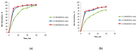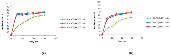 Figure 3a,b show Mn dissolution with two black copper samples using Fe2O3 in acid media. As in earlier investigations by Toro et al. [26,28], working with an Fe2O3/MnO2 ratio of 2/1 or higher significantly increased MnO2 dissolution kinetics. There was little difference in the Mn extraction rates working with Fe2O3/MnO2 ratios of either 2/1 or 3/1, while the Mn extraction fell significantly when the quantity of Fe2O3 was reduced. Potential and pH levels were respectively in the ranges of −0.5 to 1.3 V and −1.5 to 0.4 in all the tests in this study.