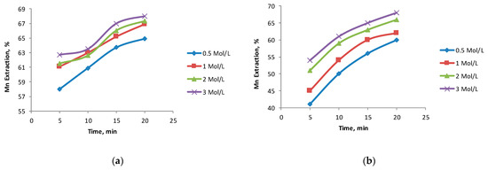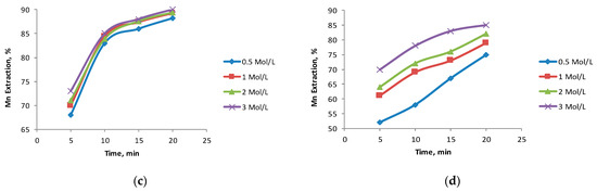 Figure 4 shows the effect of the acid concentration on dissolving Mn dissolution from the two black copper samples with the addition of high concentrations of iron oxides from tailings or ferrous ions. It can be seen from Figure 4a,c that for sample BCS-1, the sulfuric acid concentration was not significant in either case when working with high concentrations of the reducing agent. Differences in the effect of the acid concentration could only be noted with very low concentrations of iron oxide tailings (0.5 mol/L). The above concurs with findings of previous studies by Toro et al. [24,26] on extraction of MnO2 from manganese nodules. The Mn extraction rate from the BCS-2 sample increased with higher concentrations of H2SO4, possibly owing to the high consumption of acid generated by the presence of mineral impurities in this sample, mainly montmorillonite, kaolinite, and chlorite. This is consistent with what was previously found by Helle and Kelm [29], where the leaching of exotic Cu minerals (atacamite, chrysocolla, and malachite) required higher acid consumption by incorporating reactive bargains into the system. This was driven by smectites, mordenite bargain, and the presence of kaolinite, illite, and quartz.