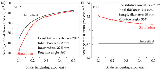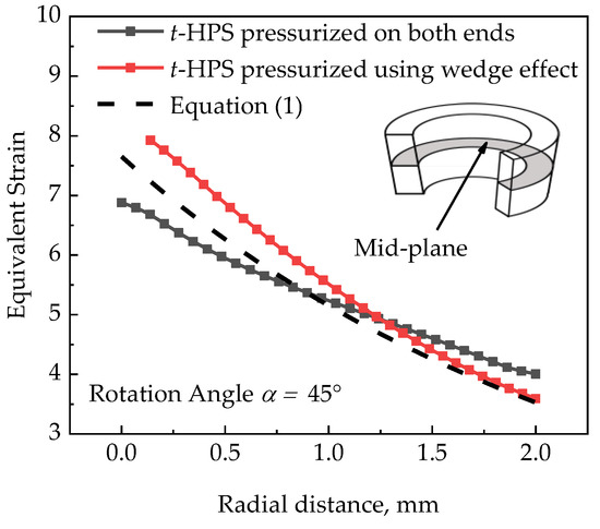 - The radial strain gradient is related to strain-hardening exponent in both ideal t-HPS described by theoretical equation and practical t-HPS described by FEM. This feature of t-HPS stands out from other SPD processes like HPT, where although materials parameters like the strain hardening exponent have an obvious effect of strain distribution, although it does not have any influence on ideal corresponding processes. This makes practical t-HPS behavior more predictable in its analytical formation than any other SPD processes, and places it in an advantageous position in understanding the basics of deformation physics through the coupling between practical experiments and theoretical approaches.