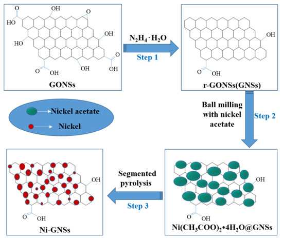 The synthesis process of the Ni-GNSs included three main steps, as follows: (1) heating reflux reduction, (2) ball mill mixing, and (3) segmented pyrolysis Ni modification. All of these three steps are shown in a schematic diagram in Figure 1.