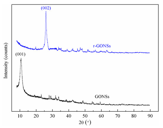 The reflection at 2θ = 11.6° was the higher diffraction peak of the GONSs, corresponding to (001) plane of GONSs with a d-spacing of 0.75 nm [30]. After the mixture of the GONSs and the N2H4∙H2O solution were reflux reduced, the original diffraction peak at 2θ = 11.6° disappeared and a new higher characteristic peak was found at 2θ = 26°, which corresponded to the (002) plane of graphene with a d-spacing of 0.34 nm [31]. A decrease in d-spacings from 0.75 to 0.34 nm was observed due to GONSs reducing to r-GONSs, implying the removal of oxygen functional groups in GONSs [32].