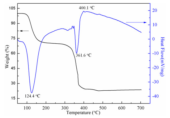 The TG-DTA curves recorded for Ni(CH3COO)2∙4H2O@GNSs in the N2 atmosphere with a flow rate of 100 mL/min are presented in Figure 3. The heating program was 35–700 °C at a rate of 10 °C/min. The DTA curve shows that Ni(CH3COO)2∙4H2O@GNSs decomposition underwent two strong endothermic processes and a weak exothermic process. The mass of the mixture sharply decreased with the increase of temperature, which corresponded to the first endothermic peak (124.4 °C) on the DTA curve. The endothermic reaction was mainly attributed to the decomposition of Ni(CH3COO)2∙4H2O. When the temperature was between 200 and 300 °C, the mass almost remained unchanged, which meant that the first weightlessness stage finished and the ratio of weight loss in this stage was calculated to be about 29.4%. It was close to the theoretical weight loss ratio (28.9%) after the loss of the four crystal-waters. This result indicated that the water of crystallization was completely lost. The second strong endothermic peak near 362 °C in the DTA curve corresponded to the second weightlessness stage on the TG curve, indicating that anhydrous nickel acetate decomposed at this temperature. De Jesus et al. [33] reported that the thermal decomposition of nickel acetate involved the following set of reactions: