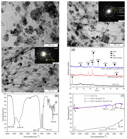 TEM images of the mixture of GNSs and nickel acetate tetrahydrate at (a) 250 °C/1 h, (b) 250 °C/1 h + 380 °C/1 h, and (c) 250 °C/1 h + 380 °C/1 h + 450 °C/1 h; (d) XRD patterns; and (e,f) FTIR spectra of nickel acetate tetrahydrate and the mixture during the segmented pyrolysis processes.