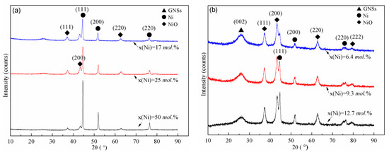 XRD patterns of the Ni-GNSs with various theoretical Ni loadings (a) 17–50 mol % and (b) 6.4–12.7 mol %.