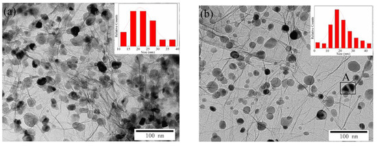 It can be seen that the GNSs displayed a sheet-like structure with many wrinkles, and the Ni and NiO nanoparticles were uniformly distributed on the GNSs. The average size of nanoparticles decreased to the minimum and then increased with the decrease of Ni loading on the GNSs. For example, the average nanoparticle size was 90 nm for the 50 mol % Ni-GNSs (Figure 5a), whereas those of 17 mol % and 9.3 mol % loadings showed average particle sizes of 31 and 40 nm, respectively. When the theoretical Ni loading was not lower than 17 mol %, the theoretical Ni content was proportional to the average particle size of the nanoparticles. This trend could be correlated to a rather consistent number of nanoparticle active/growth sites on the surface of the GNSs in spite of the metal loading level [26]. Therefore, within a certain range, the distribution and size of the nickel nanoparticles on the GNSs surface could be controlled by changing the theoretical load of nickel under the same preparation conditions. A further decrease of the theoretical Ni loading resulted in an increase of the nanoparticles size, suggesting that phase transformation may have taken place on the surface of the GNSs.