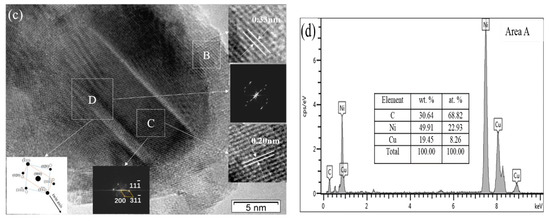 An HRTEM image was observed to investigate the Ni nanoparticles in detail (Figure 7c). Fast fourier transform (FFT) images from Zones B, C, D were also obtained (insets in Figure 7c). This showed well-ordered graphene layers, with the measured plane spacing being approximately 0.33 nm, which is close to the theoretical value of 0.34 nm of graphene. The grains on the surface of the GNSs were of the Ni-phase, with the measured plane spacing being approximately 0.20 nm. The growth morphology of the nanostructures was in accordance with the smallest surface energy principle. Ni exhibited a face center cubic (FCC) crystal structure. As a result, the (111), (200), (311), and other preferred growth planes of Ni appear (inset in Figure 7c). This is well consistent with our previous research [42]. An FCC twin crystal appeared in Region D, suggesting that the lattice distortion of Ni or the defect of GNSs existed here. As Ni is an FCC metal with low-middle stacking fault energy, annealing twins easily occur in the process of heat treatment [43].