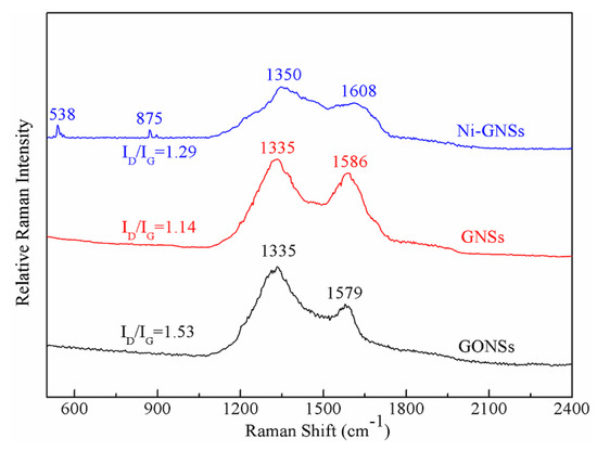 In addition, it can be seen from the Figure 8 that peak positions of D and G of the original GONSs were 1335 and 1579 cm−1, respectively. There was no significant change in the characteristic peak after the reflux reduction of GONSs, while there was an obvious frequency shift after the treatment with Ni modification. For example, the D and G peaks of the Ni-GNSs were 1357 and 1608 cm−1, respectively, suggesting the Raman peak was blue shifted (moving towards high wave number). The Raman spectroscopy of graphene under the electric field effect showed that electron/hole doping could affect the electron–phonon coupling of graphene and increase the size of the graphene sheets, causing the blue shift of the D and G peaks [46,47,48]. On the other hand, the Raman spectroscopic results of the Ni-GNSs revealed additional peaks of weak intensity at 538 and 875 cm−1, corresponding to the stretching vibration of Ni–O bond. The grain size of the porous NiO belonged to the nanoscale, and it had holes and other defects. The relatively strong Raman peak at 538 cm−1 was a first-order Raman scattering caused by the crystal defects and vibration of longitudinal optical phonon (LO) in NiO, while the weaker peak at 875 cm−1 was attributed to the second-order Raman scattering of NiO, which was consistent with the literature [49].