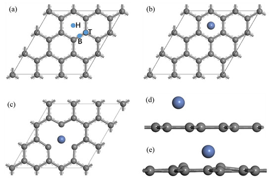 The H, B, and T positions the of graphene are three highly symmetrical sites (shown in Figure 9a) that are suitable for the adsorption of metal atoms. In our procedure, when the adatoms were placed on each site of the above three, they tended to be stable at the H site of the graphene after full relaxation. Therefore, this paper established a model based on the H site to study the adsorption mechanism of the Ni atoms on graphene. Figure 9b–e shows the adsorption model of an Ni atom on the H site of a perfect and defective GNSs. Adsorption energy is an indicator reflecting the interaction intensity between graphene and nickel atoms, that is, the total energy of the system after adsorption minus the energy of graphene and nickel atoms before adsorption, as shown in Equation (4).