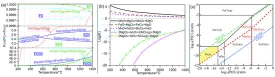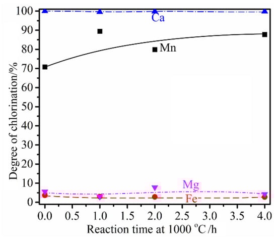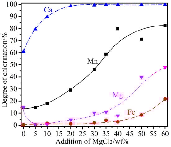 - MgCl2 was a stronger chlorinating agent comparing to CaCl2. Selective chlorination of Mn to a high degree was possible in the presence of MgCl2, in which case the presence of CaCl2 did not contribute to the chlorination. However, addition of excessive amounts of MgCl2 would lead to gradual increase in the chlorination of Fe without further improving the Mn chlorination degree. Chlorination using MgCl2 would preferably involve reacting with quartz forming magnesium silicates and MnCl2 Equations (13) and (14). Once the quartz was consumed completely, direct chlorination of MnO by MgCl2 would take place (Equation (15)).