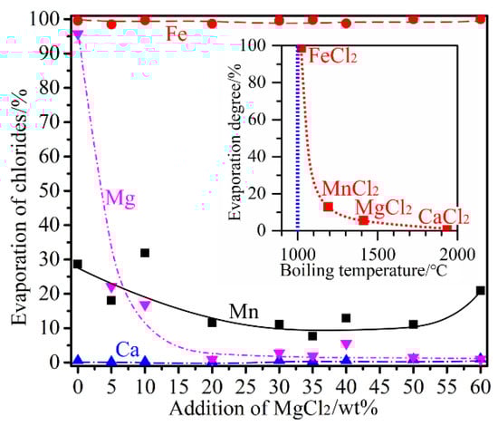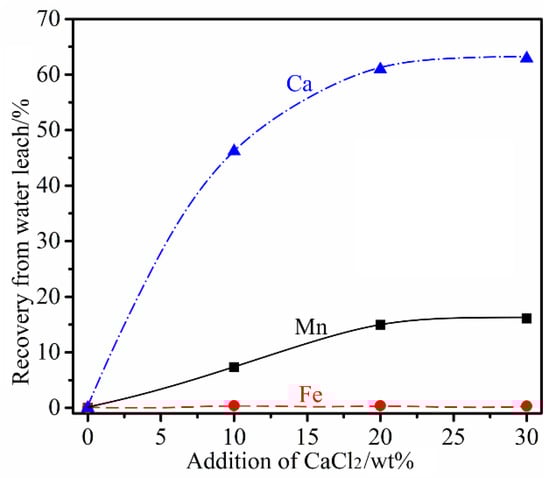 - The presence of CaCl2 greatly accelerated the selective reduction of Fe oxides to their metallic form. In addition, it promoted the formation of relatively large metallic Fe particles, facilitating their subsequent separation. In the absence of MgCl2, CaCl2 alone could selectively chlorinate Mn only to a limited degree. The chlorination involved reacting with quartz which was present in the Mn ore as gangue, forming calcium silicates and MnCl2 (Equations (10)–(12)).