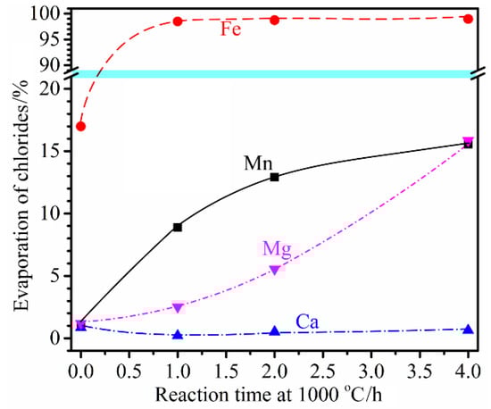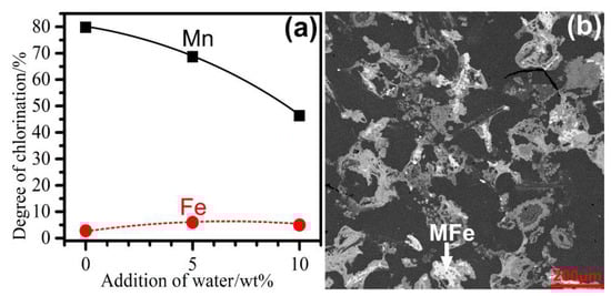 - Simultaneous chlorination of Mn and metallization of Fe from the high-Fe manganese ore is feasible. With the addition of 18 wt% graphite as the carbonaceous reductant, 20 wt% CaCl2 and 40 wt% MgCl2 as the chlorinating agent, heating the manganese ore at 1000 °C for 1 h resulted in the selective chlorination of Mn reaching as much as 89.4%, with the Fe chlorination of only 3.0%. Most Fe oxides in the ore were reduced to the metallic form, with the particle sizes generally in the range of 100–200 µm, allowing subsequent easier separation and upgrading of the metallic Fe particles.