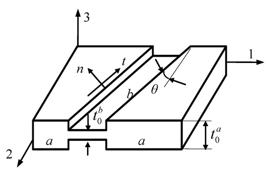 Marciniak and Kuczynski [13] proposed that necking is usually caused by geometric or structural imperfection and the original randomly distributed defects of sheet metal are assumed to be the weak area, i.e., the groove zone, and the thickness inhomogeneity is used to indicate the unevenness of the sheet metal. As shown in Figure 2, the sheet metal was divided into the uniform zone a and the weak zone b. The 1 and 2 axes indicate the principal stress directions in zone a, and the 3 axis indicates the thickness direction of the sheet metal. The normal and the tangential directions of the groove region are denoted by n and t, respectively. Moreover, the angle between the groove direction and the 2 direction is θ. For simplicity, the superscripts ‘a’ and ‘b’ are used to distinguish the corresponding variables in zones a and b.