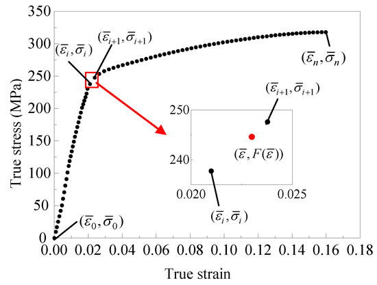 When the OMD of stress–strain were recorded as n + 1 nodes and , as shown in Figure 3. For any equivalent strain , firstly, determine the strain interval in which the strain is located, i.e., , then, the equivalent stress at any can be calculated: