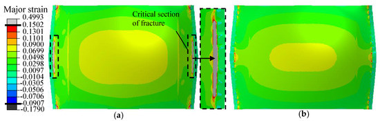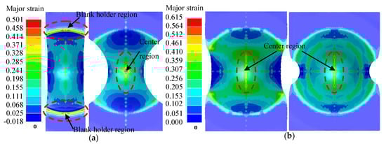 The punch-stretch test was widely used to obtain forming limits. The effective forming area of the specimen was used to design a rectangular strip, however, the numerical simulation results showed that the specimen with the small width was easily broken at the blank holder, as shown in Figure 5a. Since the rectangular specimen was subjected to the large concentrated stress at the blank holder, the large major strain appeared there, which may eventually result in the reduction of forming limits. In order to prevent failure from occurring at the blank holder region, the specimen was designed as dumbbell-shaped in the effective forming area, that is, the intermediate area was designed as the arc, which can smoothly transit from the center to both sides. The maximum value of the major strain of the dumbbell-shaped specimen appeared in center region, as shown in Figure 5.