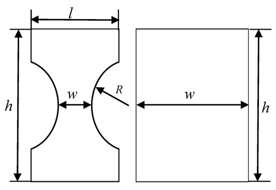 Numerical simulation results of specimens with different sizes showed that, as the width of the specimen increased, the influence of the specimen shape on the simulation result was gradually weakened. As shown in Figure 5b, when the width of the effective formed area was about 60 mm, the simulation results of the two kinds of specimens were not much different. Considering the convenience and feasibility of processing and testing, the specimens with a large width were designed as rectangle. Therefore, the shape and size of the specimens were finally determined, and the experiment scheme is as shown in Figure 6 and Table 2, respectively, where h = 90 mm.