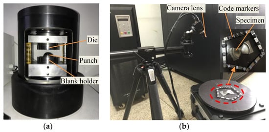 The punch-stretch tests were carried out. As shown in Figure 7a, the equipment adopted a two-stage hydraulic stretching and crimping system, which applied uniform blanking force to the specimens and improved the stability of the punch-stretch process. The ultimate strains of the sheet were obtained on the ARGUS optical strain gauge produced by GOM. This equipment can obtain the high-precision 3D full field strain data of the deformed sheet, and the main compositions of the test equipment are shown in Figure 7b.
