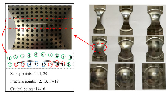 According to the designed test scheme, punch-stretch tests of different specimens were carried out. The deformed specimens are shown in Figure 8. According to the fracture position of the specimen and the deformation degree of the grid, the deformed regions of the sheet metal were divided into three categories: Fracture region, critical region, and safety region. It can be seen that the cracking degree of the specimen and the deformation degree of the mesh were different, so a mass of data needs to be extracted to predict the FLC of the sheet metal reasonably.