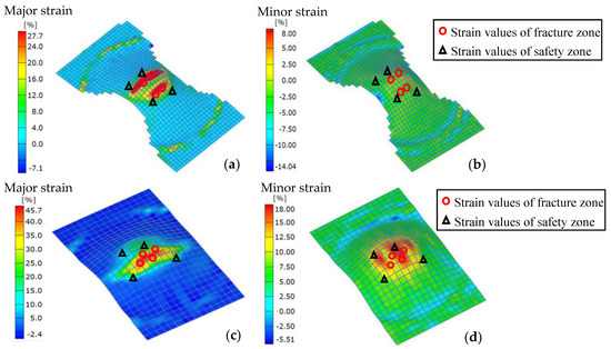 Major and minor strains’ distributions of specimens in software. (a) Major strain distribution with width of 30 mm. (b) Minor strain distribution with width of 30 mm. (c) Major strain distribution with width of 60 mm. (d) Minor strain distribution with width of 60 mm.