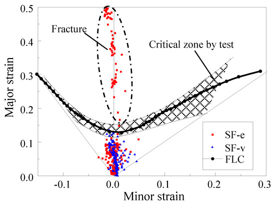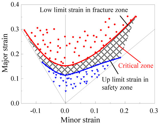 For the punch-stretch test, the major and minor strains in the safety and fracture zones are expressed in Figure 10. The strain data in the fracture and safety zones were extracted, and the strain data distributions were scattered, so it was difficult to present a clear FLC. The majority of strain data distributed in the fracture and safety zones, and very few strain data were located in the intermediate critical region. Instead, the FLC band was presented with a certain width. The two curves can be plotted to limit the dispersed strain points to a certain zone, that is, the critical zone is between the upper limit curve of the safety zone and the lower limit curve of the fracture zone. The FLC band can be regarded as the critical zone of fracture.
