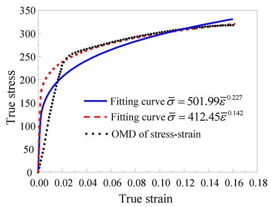 The power function stress–strain curve () was obtained by fitting experimental stress–strain data. The parameters K and n in power function based on fitting the complete stress–strain curve (including elastic and plastic deformation) were 501.99 MPa and 0.227, respectively. In addition, since the fracture occurred in the plastic deformation stage, the power function based on the stress–strain relation of plastic deformation stage was , as shown in Figure 11. It can be seen that the power function of the stress–strain curve was restricted by the equation form, which deviated from the OMD of stress–strain.