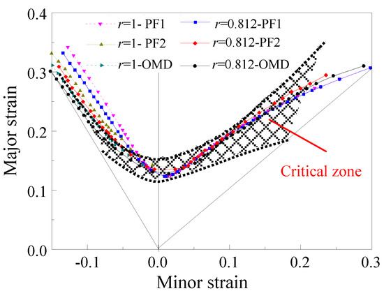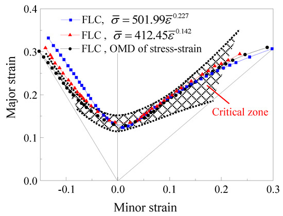 The FLCs based on different stress–strain relations were calculated, and shown in Figure 12. It was found that the theoretical FLCs based on power function of stress–strain curves were higher than the experimental FLC under the negative-strain path. The left side of FLCs based on power functions of stress–strain curves was above the critical zone of punch-stretch tests, but the right side of FLC was in the critical zone measured by punch-stretch tests. Moreover, the theoretical FLC calculated based on the power function () was closer to the test value than that based on . Finally, the theoretical FLC calculated by OMD of stress–strain was between the safety and fracture zones of punch-stretch tests, that is, the predicted major and minor strains were in the critical zone of the necking. By comparison, it was found that the stress–strain curves of sheet metal had significant impact on FLC under the negative-strain path, and the theoretical FLC based on OMD of stress–strain was more consistent with the experimental results, which verified the accuracy and superiority of the proposed method in this paper.