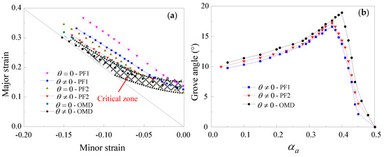 From the above analysis, it can be seen that, when the FLCs of the sheet metal were predicted by the M–K model combining with OMD of stress–strain and power functions, the FLCs under the negative-strain path were observably influenced by stress–strain relation. The FLCs under the negative-strain paths were minimized under non-zero groove angles. However, the FLCs under the positive-strain path were minimized when the groove angle was zero. In order to analyze the effect of the groove angle on the FLCs, the left side of the FLC was calculated with zero and non-zero groove angles, as shown in Figure 14a. It can be seen that the FLCs predicted by three methods were higher in zero angle than in non-zero angle, and the predicted FLCs were closer to the experimental data in non-zero groove angle. Therefore, in order to accurately predict the FLCs, the FLCs in the negative-strain paths should be calculated at non-zero groove angles. In addition, when the ultimate strains take the minimum values, the variations of groove angle with different strain paths are shown in Figure 14b. It was found that, when the ultimate strain took the minimum value, the groove angle increased firstly and then decreased when sheet deformations changed from the uniaxial tension to the plane strain state. The groove angle at the plane strain state was zero with the minimum strain, which was consistent with the minimum value of the forming limit in the right side when the groove angle was zero. Therefore, the groove angle had a certain influence on the left side of the FLC.