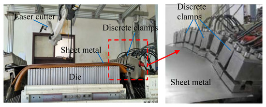 The FLC was applied to evaluate whether the three-dimensional curved parts appear in the fracture defect during the stretch-forming process, and the fracture defect can be predicted by FLC. The stretch-forming process is an important method for forming three-dimensional curved parts. It is widely used to form the skin parts of aircraft and spacecraft, the front of high-speed trains, the outer plates of ships, and the large-curvature curved parts of modern buildings. The integral clamps in a conventional stretch-forming process were replaced by discrete clamps based on loading at multi-positions, as shown in Figure 15. The displacement load was applied at a series of discrete clamps on the two ends of the sheet metal, and the load of each loading point was controlled in real time, so that the deformed sheet could actively deform along with the die profile. The discrete clamps made the sheet metal bend and stretch according to the die surface, and ultimately realized the complete fit between the sheet metal and the die, forming high-precision surface parts.