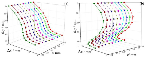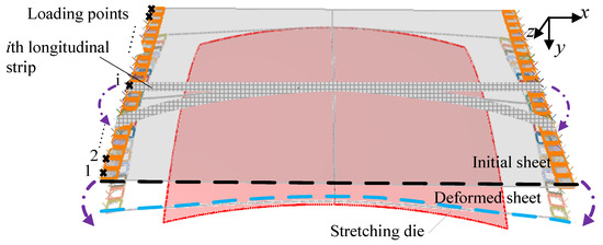 Since the influence of the sheet width on the longitudinal strain was relatively small, it was considered that the sheet metal was composed of several longitudinal strips with the same width as the discrete clamps, and the corresponding strips were deformed by controlling the displacements at the loading points. The deformation process of ith longitudinal strip is shown in Figure 16. The loading trajectory was the moving locus of the end of the material line during the process. It was seen that the material line changed from its initial length to an intermediate length and finally to the length corresponding to the arc length of the stretching die. In the stretch-forming process based on equal elongation (SF-e), it was assumed that the elongation of the longitudinal strip of the sheet metal was equal, and the displacement of each loading point was calculated separately. In the stretch-forming process based on variable elongation (SF-v), the elongations of the longitudinal strips of the sheet metal varied and were determined by cubic functions in the forming process. The details for deriving the process of equal elongation loading mode and variable elongation loading mode can be found in reference [43].