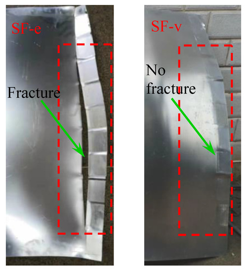 In order to verify the numerical simulation results of the stretch-forming process in different loading trajectories, the stretch-forming experiments for spherical parts of aluminum alloy 6016-T4 were carried out on a homemade apparatus by Jilin University, as shown in Figure 15. The critical sections of fracture of experimental parts are shown in Figure 20. It can be seen that the large deformation was produced in SF-e, and the severe fracture defect appeared in the center region that was adjacent to the discrete clamps. However, in SF-v, as indicated by experimental result, the target surface part was perfectly manufactured without fracture defect. In conclusion, the experiment results verified the accuracy of the numerical simulation and FLC prediction, and the fracture defect appeared in the region where the strain points exceeded the theoretically calculated ultimate strains.