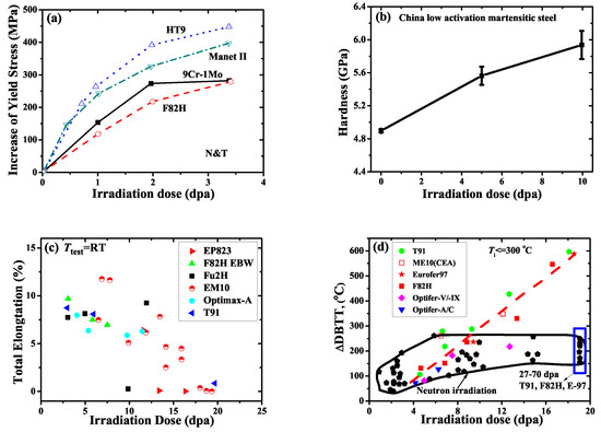 - Azevedo, C.R.F. A review on neutron-irradiation-induced hardening of metallic components. Eng. Fail. Anal. 2011, 18, 1921–1942. [Google Scholar] [CrossRef]