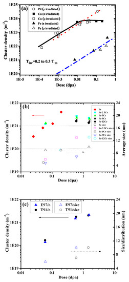 | Fe-Cr alloys [61] | DLs and solute rich clusters | 0.06–1.5 dpa and 433–573 K with neutrons |