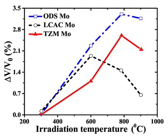 - Cockeram, B.V.; Smith, R.W.; Hashimoto, N.; Snead, L.L. The swelling, microstructure, and hardening of wrought LCAC, TZM, and ODS molybdenum following neutron irradiation. J. Nucl. Mater. 2011, 418, 121–136. [Google Scholar] [CrossRef]