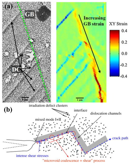 - McMurtrey, M.D.; Cui, B.; Robertson, I.; Farkas, D.; Was, G.S. Mechanism of dislocation channel-induced irradiation assisted stress corrosion crack initiation in austenitic stainless steel. Curr. Opin. Solid State Mater. Sci. 2015, 19, 305–314. [Google Scholar] [CrossRef]