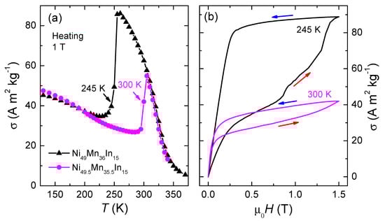 (a) Temperature dependence of magnetization of Ni49Mn36In15 and Ni49.5Mn35.5In15 samples measured at selected fields. (b) Magnetization/demagnetization curves at temperatures close to the martensitic transition.