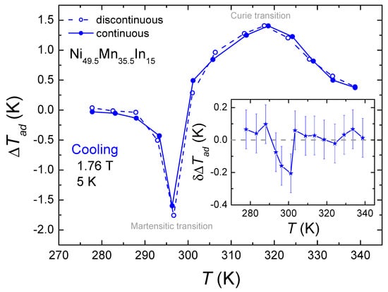 The temperature dependence of ΔTad at 1.76 T while cooling using discontinuous (i.e., erasing the memory of the sample between measurements) and continuous (i.e., not erasing it) measurement protocols with a temperature step of 5 K for Ni49.5Mn35.5In15 sample is shown in Figure 2. Two peaks are clearly observed, which correspond to the martensitic and Curie transitions (around 295 K and 320 K, respectively). The former response is larger than the second one, although it happens in a narrower temperature range (as expected from the characteristics of each transition, i.e., an abrupt change for FOPT and a gradual change for SOPT). A magnetic field sweep rate of 0.5 T s−1 was selected for both samples. The discontinuous protocol was applied by subjecting the sample to a reset temperature of 350 K and 1.76 T (which is well above its martensitic transition of ~295 K). Error bars correspond to the precision of the system (close to room temperature ≈ 0.06 K). The different ΔTad results of Ni49.5Mn35.5In15 show slight differences for the two measurement protocols in the region close to the martensitic transition while in the region close to the ferro-paramagnetic transition there are no differences. This is further magnified in the inset of Figure 2 using the temperature dependence of δΔTad (where δΔTad = ΔTad (continuous) − ΔTad (discontinuous)), however, the error bars avoid any detailed discussion. In addition, similar features are observed for the ΔTad results using both protocols while heating (not shown).