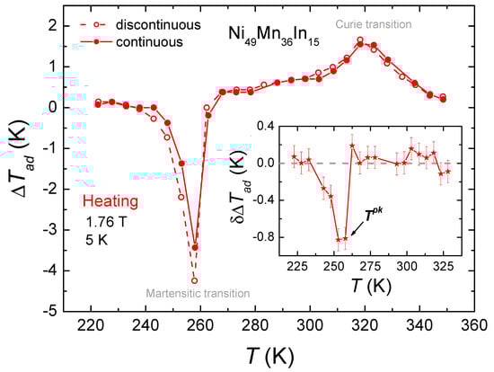 Figure 3 shows the temperature dependence of ΔTad at 1.76 T while heating using discontinuous and continuous measurement protocols with a temperature step of 5 K for Ni49Mn36In15 alloy. In this case, the heating protocol was used with a reset temperature of 200 K and zero field, well below the martensitic transition around 260 K. For this sample, significant differences in the two curves with and without accounting for its history are observed (further magnified by δΔTad in the inset of Figure 3). The ΔTad values associated to the martensitic transition are underestimated using the continuous protocol (maximum differences ≈ 20% are obtained around the peak temperature of ΔTad, ), while the curves are relatively similar in the region close to the ferro-paramagnetic SOPT. In addition, the differences between their cooling ΔTad(T) curves using both protocols are also notable, in agreement to those observed from the heating protocol. To establish a comparison between both samples, it is important to note that the mass and shape of both samples are quite similar, in order to avoid the influence of these parameters in the general conclusions. With respect the hysteretic behavior, Figure 1b shows the magnetization/demagnetization curves at selected temperatures close to the martensitic transition for both samples. The hysteresis can be associated with the area enclosed between magnetization/demagnetization curves, being 50.2 and 9.6 A m2 kg−1 T−1 for the Ni49Mn36In15 and Ni49.5Mn35.5In15, respectively. According to this, the magnetic hysteresis is larger for the Ni49Mn36In15 sample, explaining why the differences between discontinuous and continuous protocols are more significant for this alloy (the discussion of the different hysteresis mechanisms is beyond the scope of this work). Furthermore, in agreement with the previous argument, the observed thermal hysteresis span between cooling and heating curves is larger for the Ni49Mn36In15 sample than for the Ni49.5Mn35.5In15 one, ≈12 and 6 K, respectively, which in the latter case is quite close to the selected temperature steps.