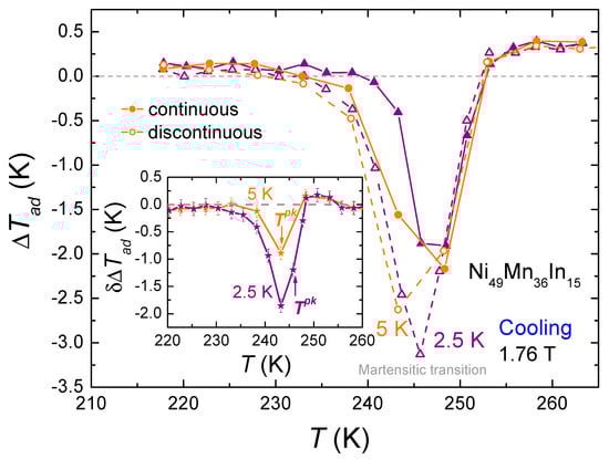 To evaluate the influence of the temperature step on the direct measurements, a finer temperate step resolution of 2.5 K was used. It can be observed that the influence of the protocol on ΔTad while cooling becomes more significant near the martensitic transition of Ni49Mn36In15 sample (for which the effects are more evident) with decreasing the temperature step (5 and 2.5 K are used for comparison), as shown in Figure 4. For the cooling protocol, a reset temperature of 350 K and a magnetic field of 1.76 T were chosen. The underestimation of ΔTad peak associated to martensitic transition increases to ~40% (a two-fold increase in comparison to the 5 K step measurements). With this finer resolution of the ΔTad curves, the peak temperature slightly shifts to higher temperatures when using continuous protocols. In addition, in the case of using discontinuous protocols (either for cooling or heating curves), the different ΔTad measured points are independent of the temperature step resolution, as expected.