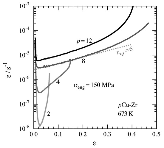 Figure 2 shows exemplary curves of the evolution of deformation resistance with strain at constant engineering stress for different amounts p of ECAP predeformation. Deformation starts with application of the load F, and continues in creep mode when the creep stress has been reached. The starting phase of the tests is connected with work hardening as is visible from the sharp decrease of strain rate with . After strains of 0.02 to 0.05 the rate increases. A trivial reason for -increase lies in the increase of with (Equation (2)) causing the creep rate to increase in the qs state as where is the qs value of the stress exponent. The dotted line in Figure 2 shows that for severely predeformed Cu-Zr with practically all of the -increase can be attributed to the increase of when (as reported before [9]). This means that at