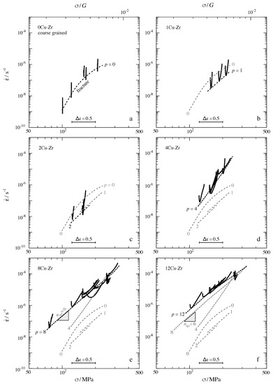 The less strongly predeformed specimens 4Cu-Zr and 2Cu-Zr exhibit a distinctly steeper increase of with . To find the reason for that, it is useful to display the creep process in the qs region near the minimal creep rate, i.e., the creep between the work hardening period and the fracture period, in the -field (Figure 3). According to Equation (2), increases linearly with . The scale-bars in Figure 3 show the extension of a strain interval of 0.5. Figure 3e confirms that most of the curves for 8Cu-Zr have slopes near in the qs range above 150 and follow a common trend given by the dashed black line. For 12Cu-Zr this behavior is even more perfectly pronounced, indicating better homogeneity of the initial microstructure.