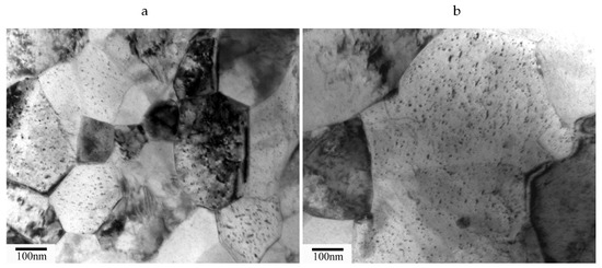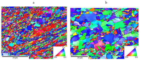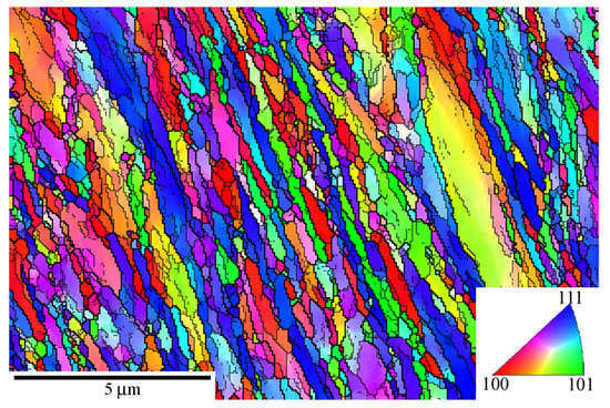 Observations of the grain structure were made by electron microscopy. Orientation maps derived from electron backscatter diffraction (EBSD, device from Oxford Instruments, High Wycombe, United Kingdom) were used to determine the grain size d as mean value of the spacings , , of HABs between crystallites with misorientations determined along test lines. Transmission electron microscopy (TEM) images (microscope from JEOL Ltd., Tokyo, Japan) were used to analogously determine the subgrain size w as mean value of the spacings of boundaries of any kind.