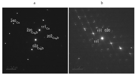 Diffraction patterns of (a) Cu matrix (strong reflections) with Cu5Zr particles (weak reflections) and (b) a large Cu5Zr particle.