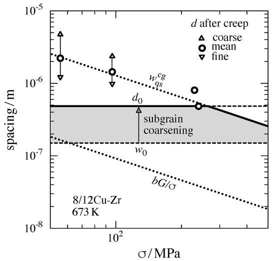 The spacing plot of Figure 7 shows and together with the qs spacings of dislocations and of boundaries in cg Cu. We assume that the qs spacings for cg Cu are valid also for Cu-Zr. It is interesting to note that at low stresses the (dotted) qs dislocation spacing would be similar to the initial boundary spacing , meaning that the subgrains will tend to be virtually dislocation-free in the beginning of creep. This will increase the mobility of boundaries. As is smaller than in the whole stress interval of creep (Figure 7), the subgrains will tend to coarsen with strain toward the quasi-stationary value as long as the grains provide enough space, i.e., as long as w is smaller than d. The grey area marks the range of possible subgrain coarsening under the simplifying assumptions that all grains are equiaxed and keep the same size throughout deformation. The solid black line marks the qs boundary spacing in ufg 8Cu-Zr under these conditions. If this line were exactly valid, all grains would become subgrain-free during deformation for stresses . However, that is unrealistic because of (i) the wide distribution of HAB spacings (Figure 9) and (ii) dynamic grain growth (see below).