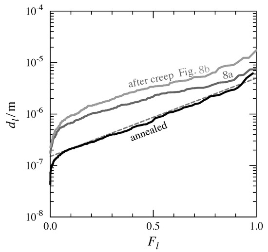 Figure 8 shows grain structures after creep at low . There is a mixture of large and fine grain sections. The largest ones are much coarser than in the initial state (Figure 4 and Figure 7). Coarsening is also seen from the TEM micrograph of Figure 5b after fracture at = 150 in comparison to Figure 5a taken before creep. However, this is probably mainly due to subgrains growing from (Figure 5a) in the attempt to attain the qs spacing . Figure 9 shows the distributions of individual HAB-spacings determined from Figure 4 and Figure 8. We will use them as rough experimental input to the model presented in Section 4.