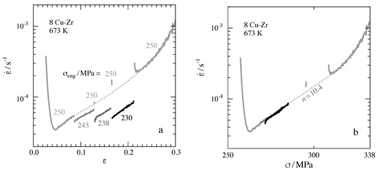 Figure 10 displays the -evolution of ufg 8Cu-Zr from the overview of Figure 3e in greater detail as function of strain . For comparison, the grey dotted lines show the increase of with expected for qs deformation with at constant . The scatter in the series of tests at indicates that the thermomechanical pretreatment was not perfect and led to some variations of microstructures and strengths. The intermediate -increase to 83 in the test starting at 75 causes a jump in the qs level of at (see black squares) which corresponds to . This is in reasonable agreement with . At high (true) stresses and strain rates s−1 the exponent appears to gradually increase with beyond 6. This is seen from the test of Figure 11 with a series of load reductions compensating the increase of with (Equation (2)). When the abscissa in Figure 11a is exchanged for in Figure 11b, all the branches with shift to the left and superimpose. A common – line describes both the superimposed curves and their (dashed) connection to the final branch with . The slope of the dashed connection is given by at .